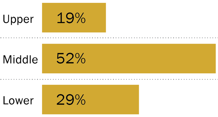 About half of U.S. adults (52%) lived in middle-income households in 2018, according to a new Pew Research Center analysis of government data. Roughly three-in-ten (29%) were in lower-income households and 19% were in upper-income households at Are you in the American middle class? Find out with our income calculator.